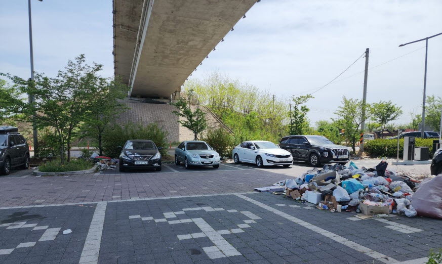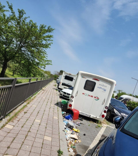 주차 공간에 장기간 머무는 캠핑카와 대형 차량도 문제다. 일부 캠핑카에서 배출되는 생활오수와 쓰레기가 주변에 방치되면서 추가적인 환경오염이 발생하고 있다. 또한 교량 구조물 가까이에 대형 차량이 상시 주차되면서 보행자 안전사고 우려도 제기되고 있다.