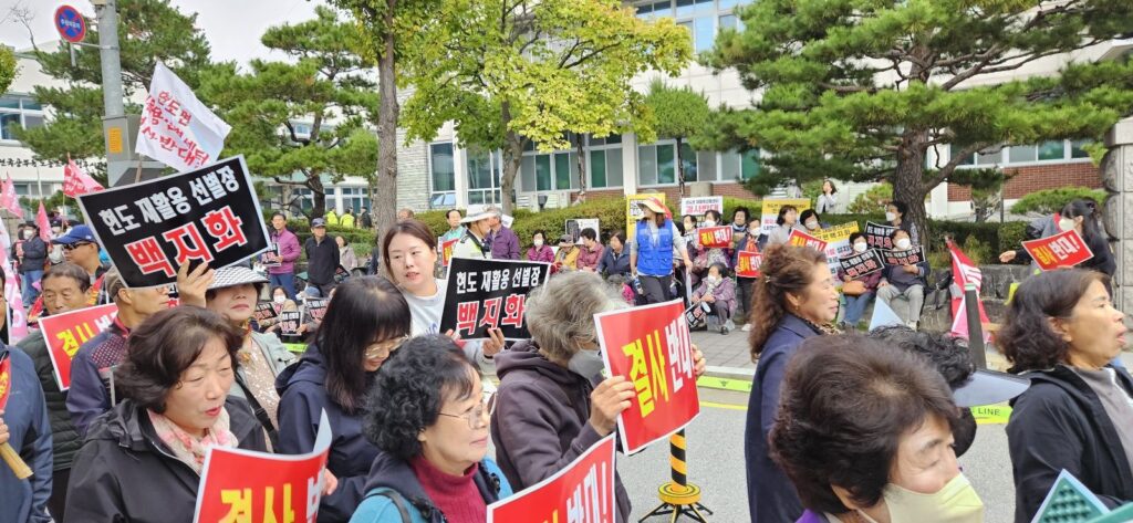 주민들은 “결사 반대”, “현도 재활용 선별장 백지화”라고 적힌 피켓을 들고 “주민 동의 없이 일방적으로 추진된 사업을 즉각 철회하라”고 목소리를 높였다.